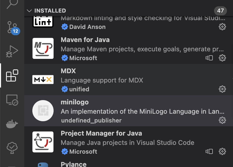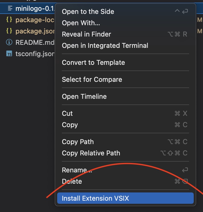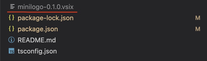 You should now see a VSIX extension file in the root of your project. The name of this file will correspond with the name and version properties listed in your package.json. For MiniLogo, this produced minilogo-0.1.0.vsix.